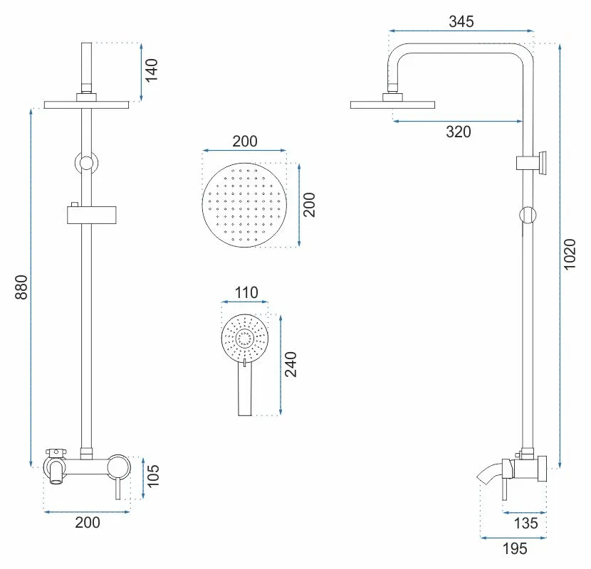 Комплектация: металлическая розетка, эксцентрики, душевой шланг, душевая лейка, держатель для душевой лейки, верхний душ, кронштейн, душевая штанга, излив.