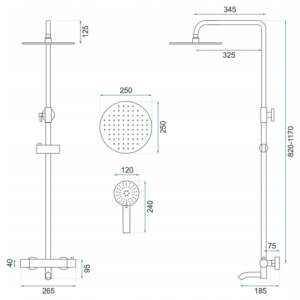 Монтаж: настенный. Верхний душ: D250 мм. Форма: круглая. Управление: термостатическое. Излив: да. Выступ излива: 185 мм. Дивертор: керамический. Регулировка по высоте: да.