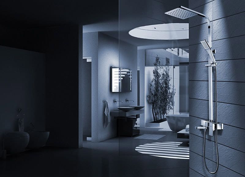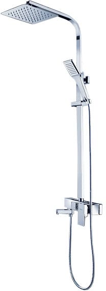 Душевая стойка со смесителем, квадратным верхним и ручным душем.
