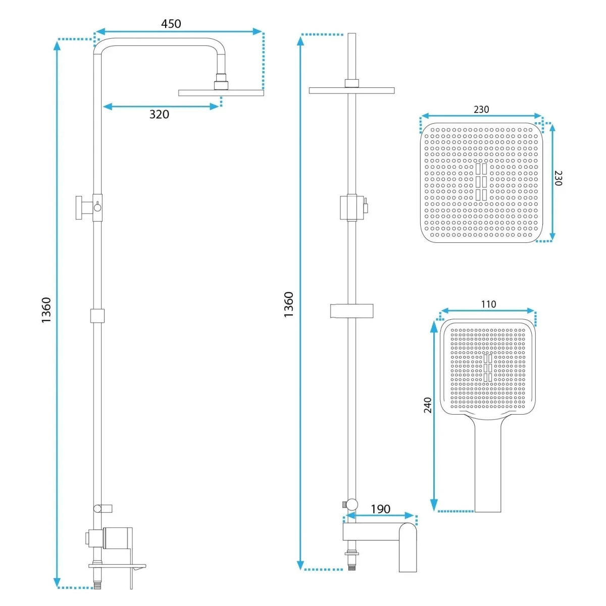 Комплектация: металлическая розетка, эксцентрики, душевой шланг, душевая лейка, держатель для душевой лейки, верхний душ, кронштейн, душевая штанга.