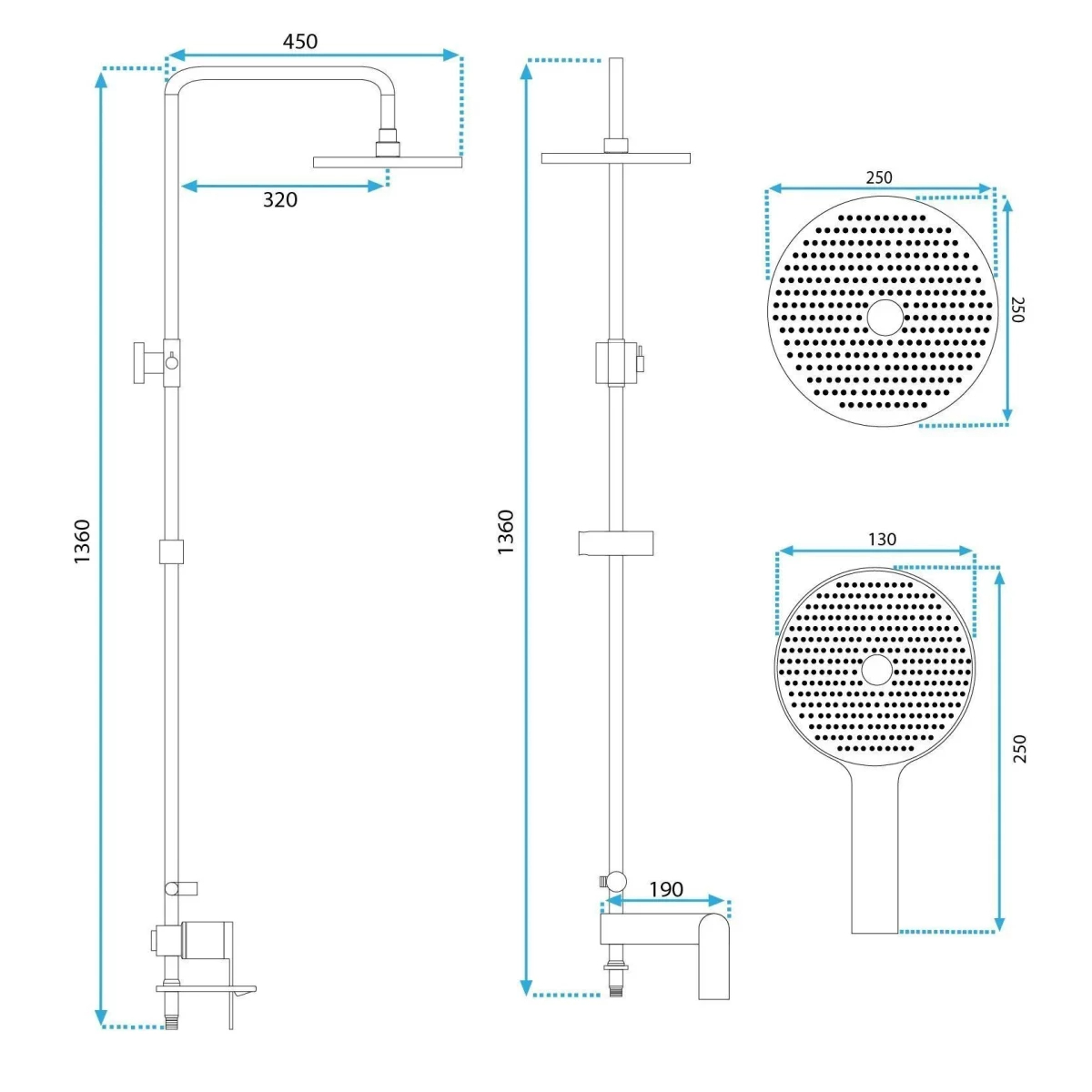 Комплектация: металлическая розетка, эксцентрики, душевой шланг, душевая лейка, держатель для душевой лейки, верхний душ, кронштейн, душевая штанга, излив.