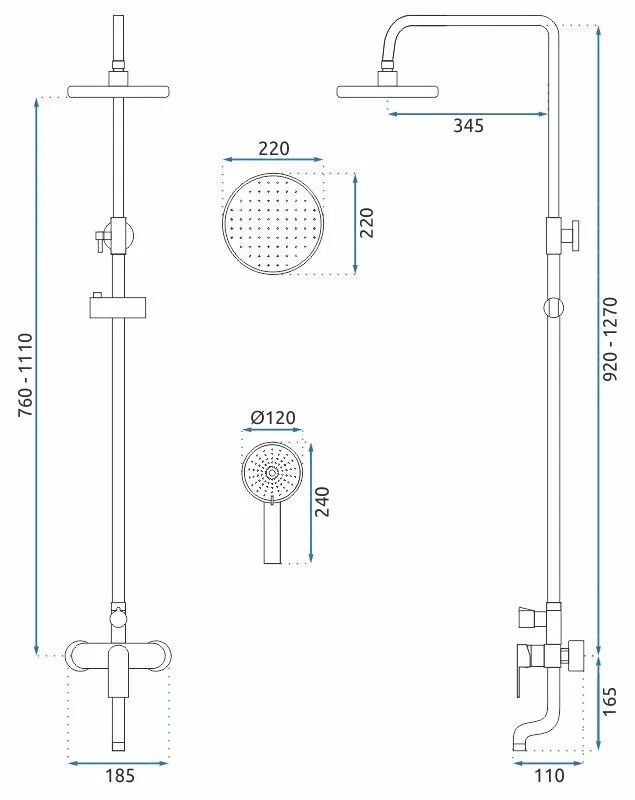 Комплектация: металлическая розетка, эксцентрики, душевой шланг, душевая лейка, держатель для душевой лейки, верхний душ, кронштейн, душевая штанга.