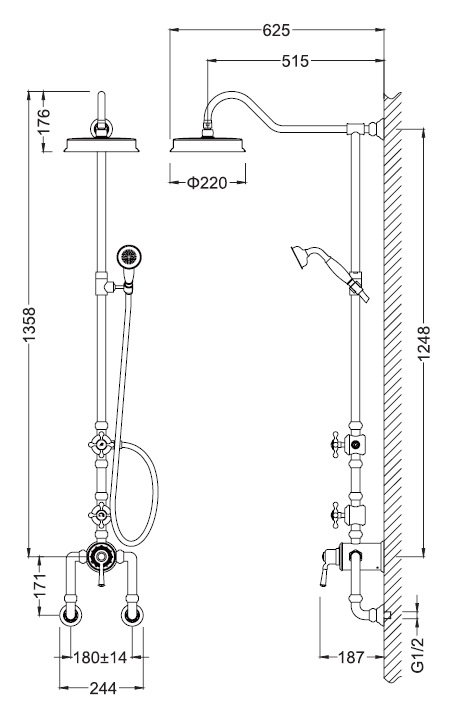 Размеры: диаметр 220 мм, душевой шланг 1500 мм, расстояние между центрами 180 мм, адаптер на 150 мм