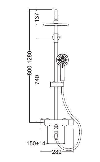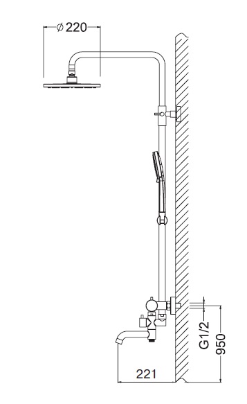 Размеры: диаметр 220 мм, излив 221 мм, душевой шланг 1500 мм, расстояние между центрами 150 мм