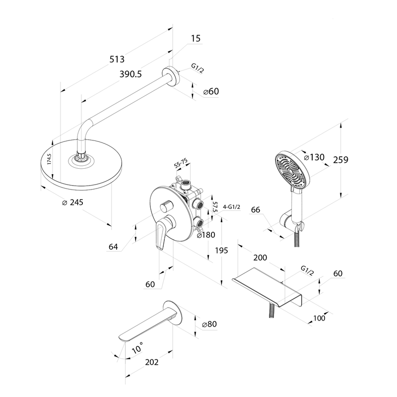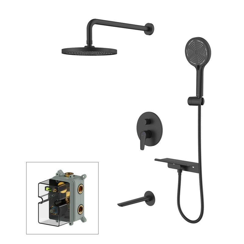 Смеситель скрытого монтажа с 3 выходами с внутренней частью, функциональный бокс, верхняя лейка ABS-пластик диаметром 245 мм, кронштейн из нержавеющей стали, длина 390 мм, латунный излив 202 мм, ручная лейка ABS-пластик 3 режима, диаметр 130 мм, выход для шланга с полкой, держатель для лейки, шланг 150 см. Цвет: черный матовый