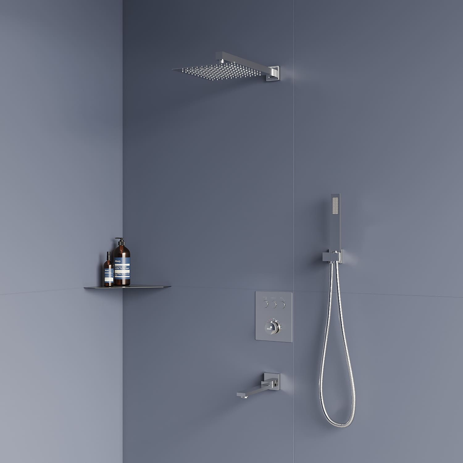 Головной душ и горизонтальный держатель из нержавеющей стали.