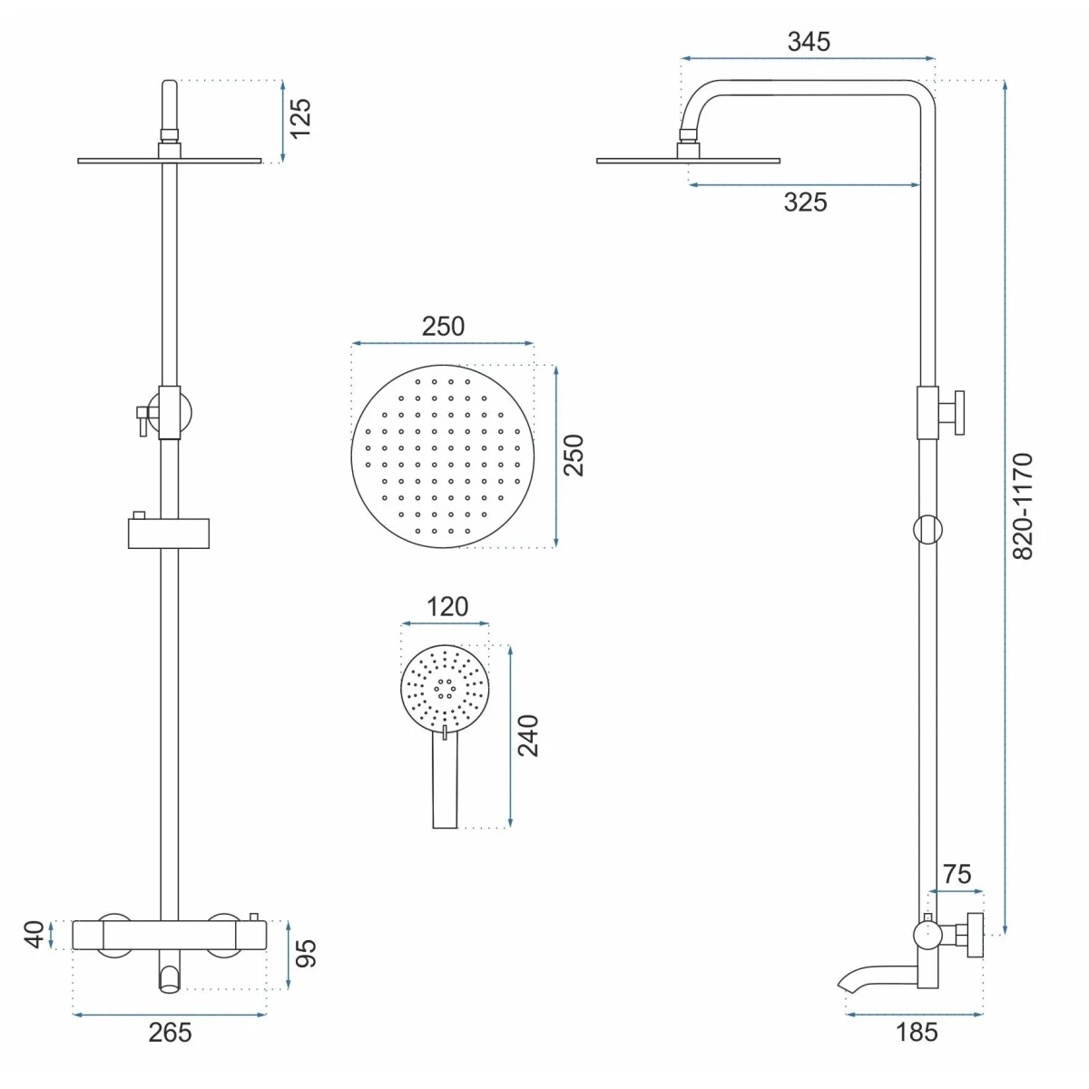 аэратор, металлическая розетка, эксцентрики, душевой шланг, душевая лейка, держатель для душевой лейки, верхний душ, кронштейн, штанга душевая, термостат, излив