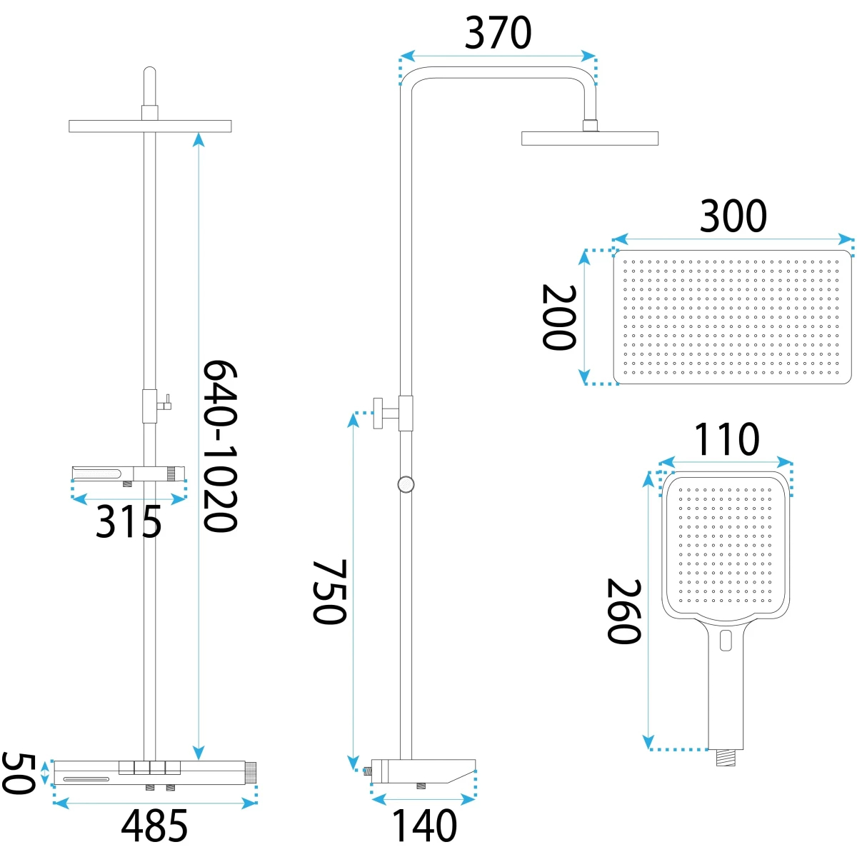 Комплектация: металлическая розетка, эксцентрики, душевой шланг, душевая лейка, держатель для душевой лейки, верхний душ, кронштейн, душевая штанга.