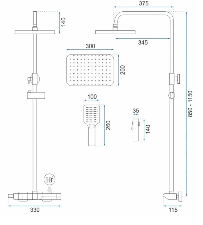 Комплектация: металлическая розетка, эксцентрики, душевой шланг, душевая лейка, держатель для душевой лейки, верхний душ, кронштейн, душевая штанга.