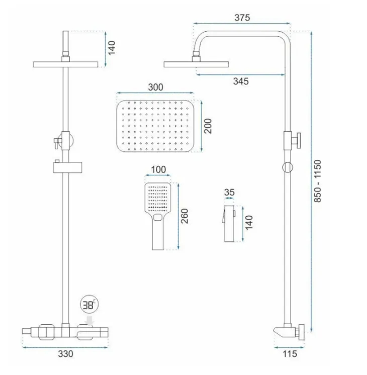 Комплектация: металлическая розетка, эксцентрики, душевой шланг, душевая лейка, держатель для душевой лейки, верхний душ, кронштейн, душевая штанга.