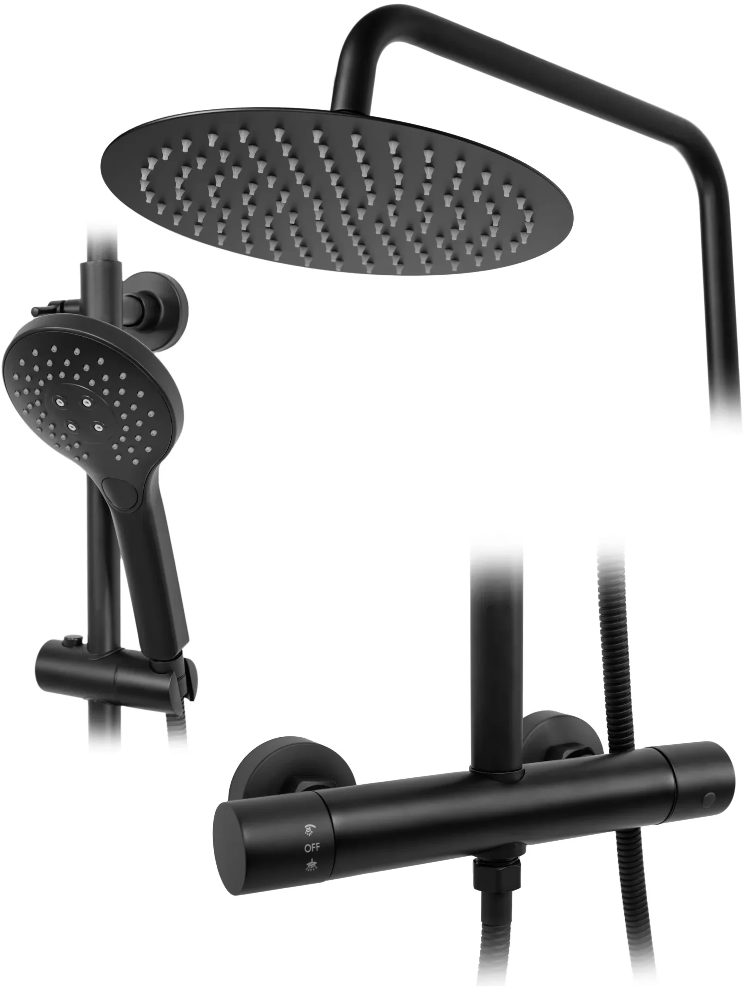 Комплектация: металлическая розетка, эксцентрики, душевой шланг, душевая лейка, держатель для душевой лейки, верхний душ, кронштейн, душевая штанга, термостат.