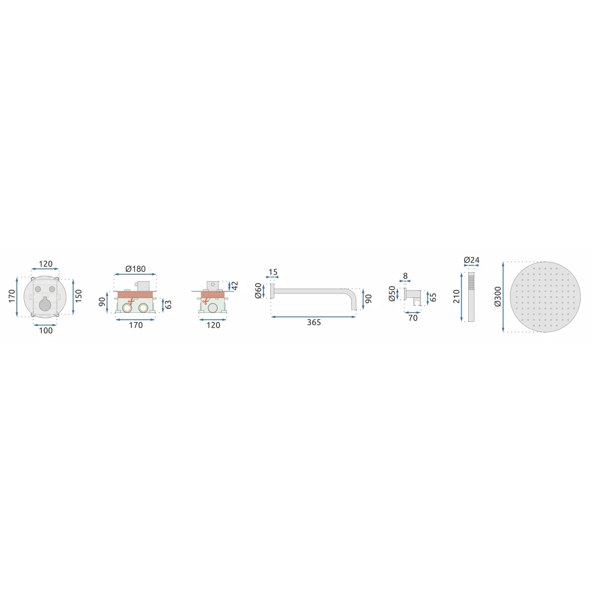 Комплектация: смеситель, душевой шланг, душевая лейка, держатель для душевой лейки, верхний душ.