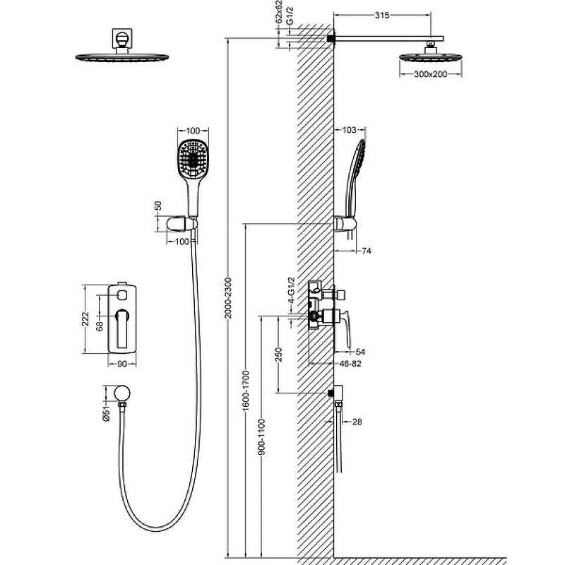 - Прямоугольный верхний душ размером 30 х 20 см.