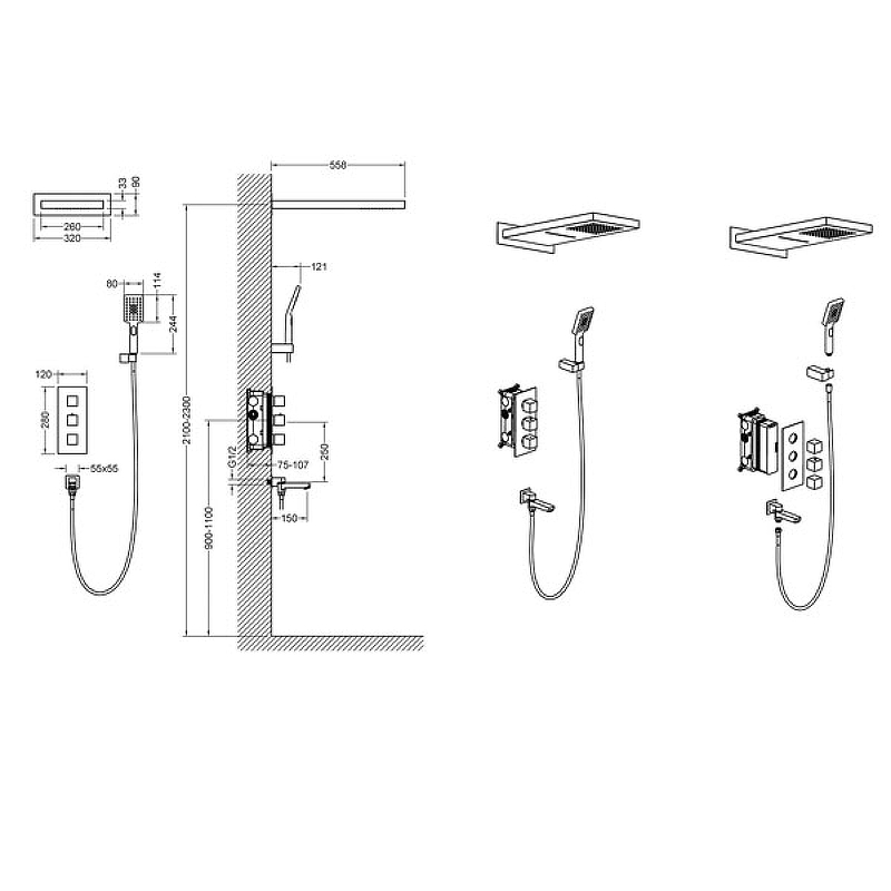 - Верхний душ: тропический дождь, квадратный, размер: 52х 32 см.