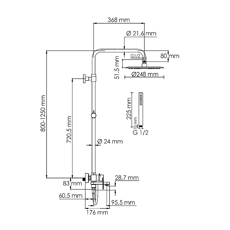 - Стойка для душа, 24 мм регулируемая по высоте