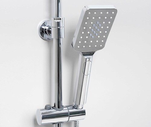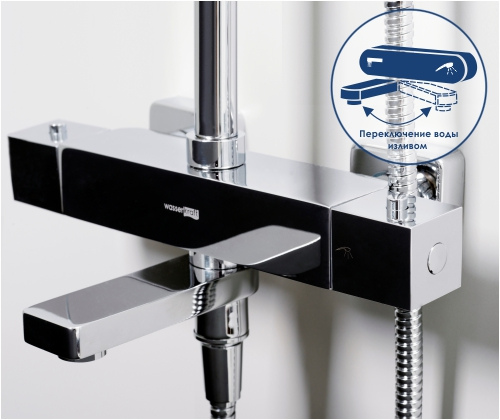 Состав поставки: смеситель термостат, верхний душ 30 см, душевой шланг 150 см, душевая лейка 3 режима струи, аэратор, держатель для душа, переключатель потоков