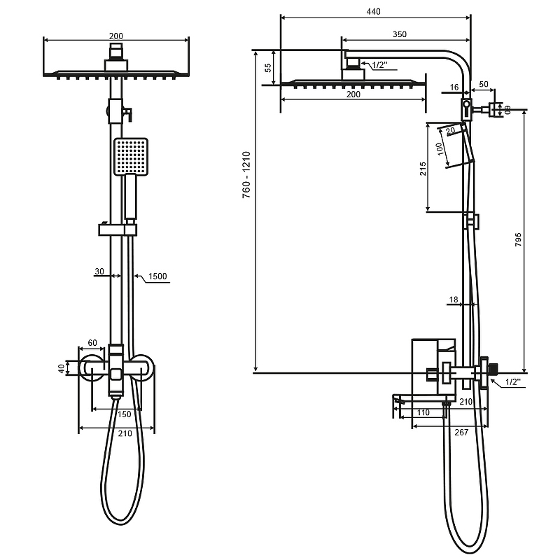 Регулируемая высота душевой стойки 76-121 см