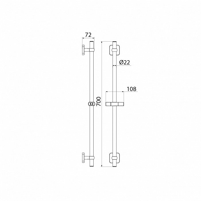 Стойка для душа, хром, нержавеющая сталь с никель-хромовым покрытием, высота 700 мм, диаметр 22 мм. Крепления свободные. Держатель лейки из ABS-пластика, поворотное крепление, регулировка наклона лейки. Крепеж в комплекте.