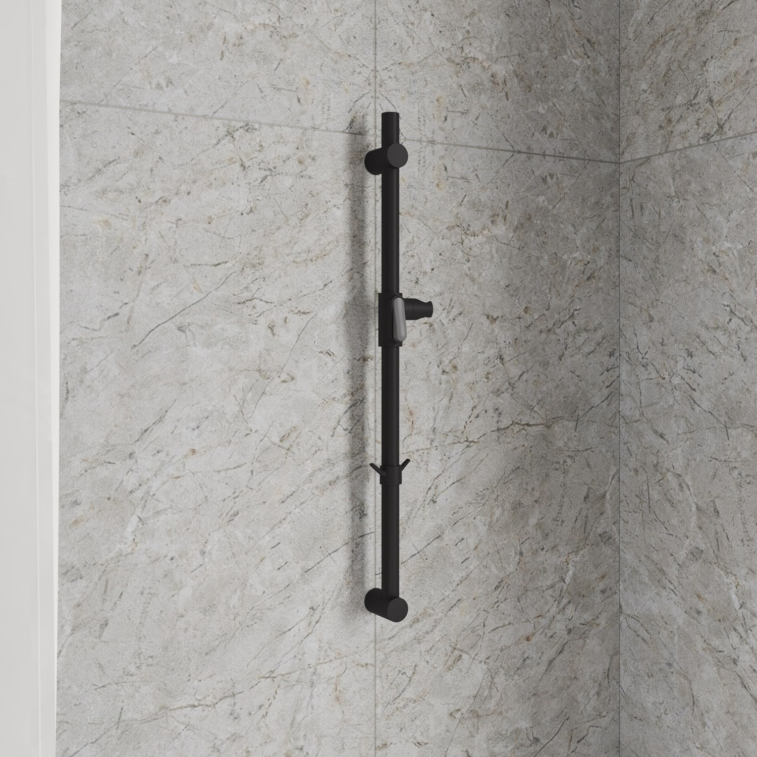Стойка для душа, высота - 700 мм, круглая форма, диаметр трубки - 25 мм, материал - нержавеющая сталь, цвет - черный матовый. Регулируемый держатель для лейки с нажимным фиксатором из ABS-пластика.