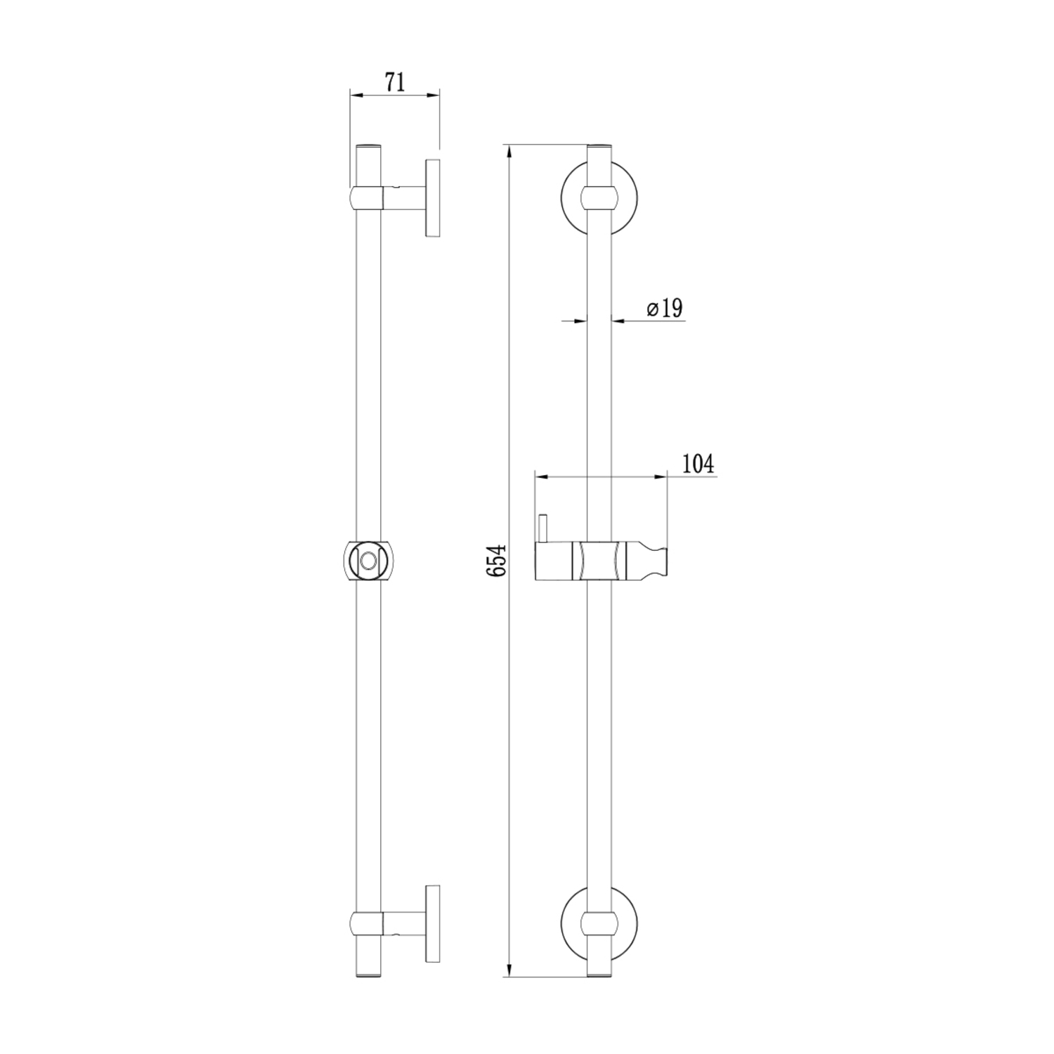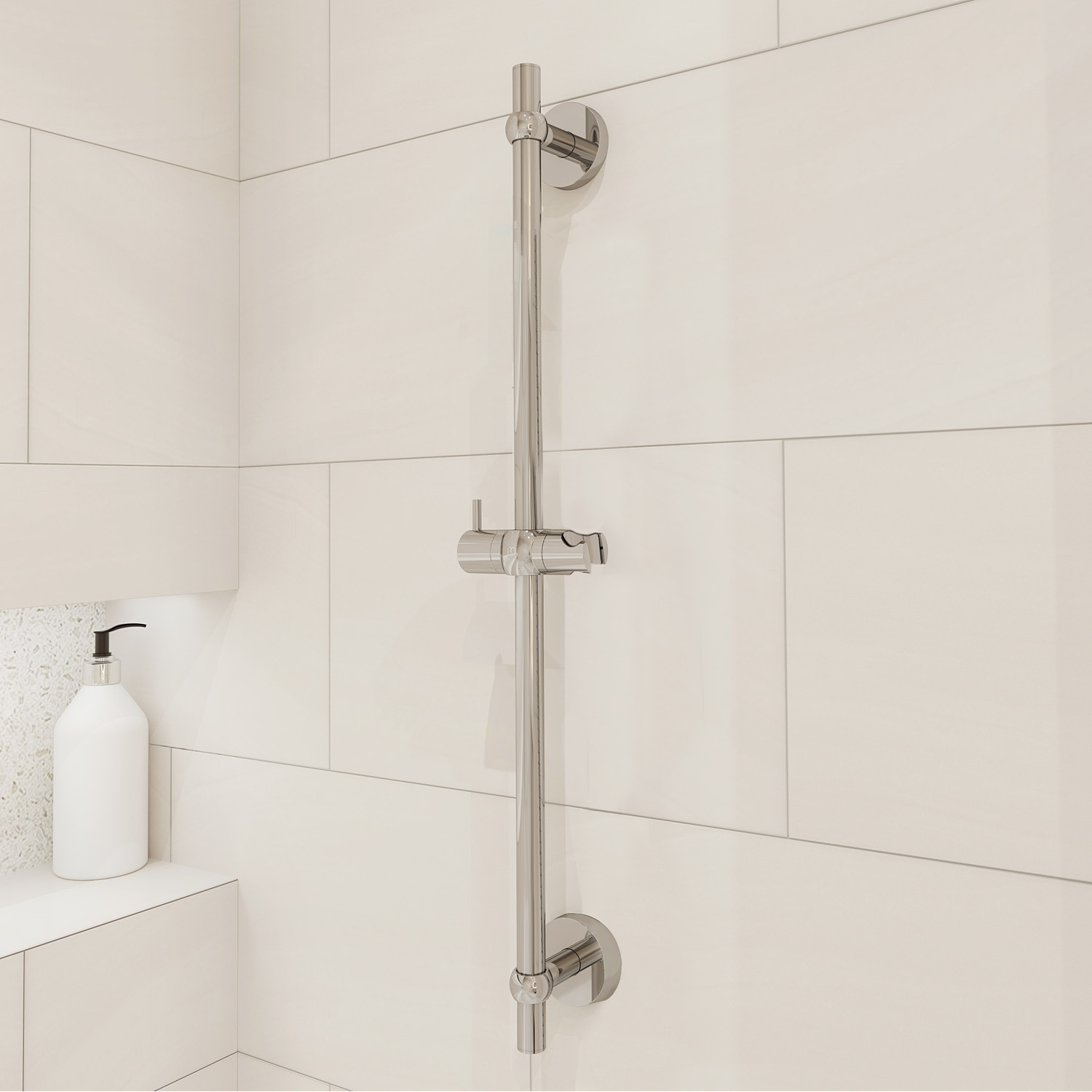 Стойка для душа, хром, нержавеющая сталь с никель-хромовым покрытием, высота 650 мм, диаметр 19 мм. Крепления свободные. Держатель лейки из ABS-пластика, поворотное крепление, регулировка наклона лейки. Крепеж в комплекте.