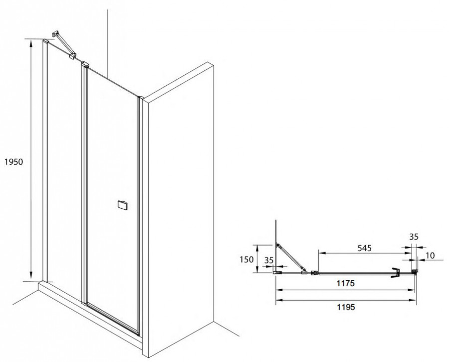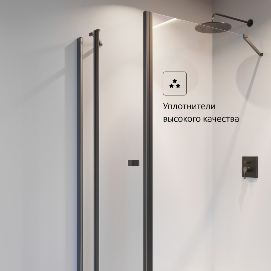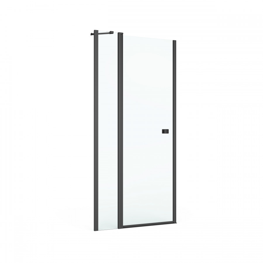 Распашная дверь поворотного типа с фиксированной панелью, Дверь открывается вовне на 90 градусов, Безопасное закаленное стекло 6мм с покрытием MaxiClean, Алюминиевые профили в черном матовом цветовом исполнении, Уплотнители высокого качества, Возможен монтаж без душевого поддона, Для установки в нишу требуется дополнительный профиль.