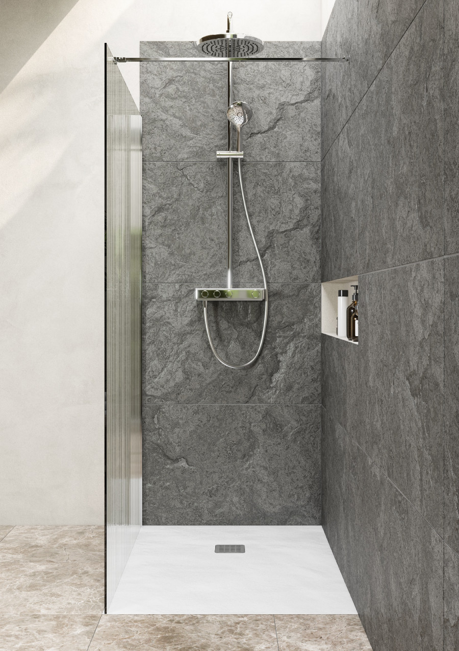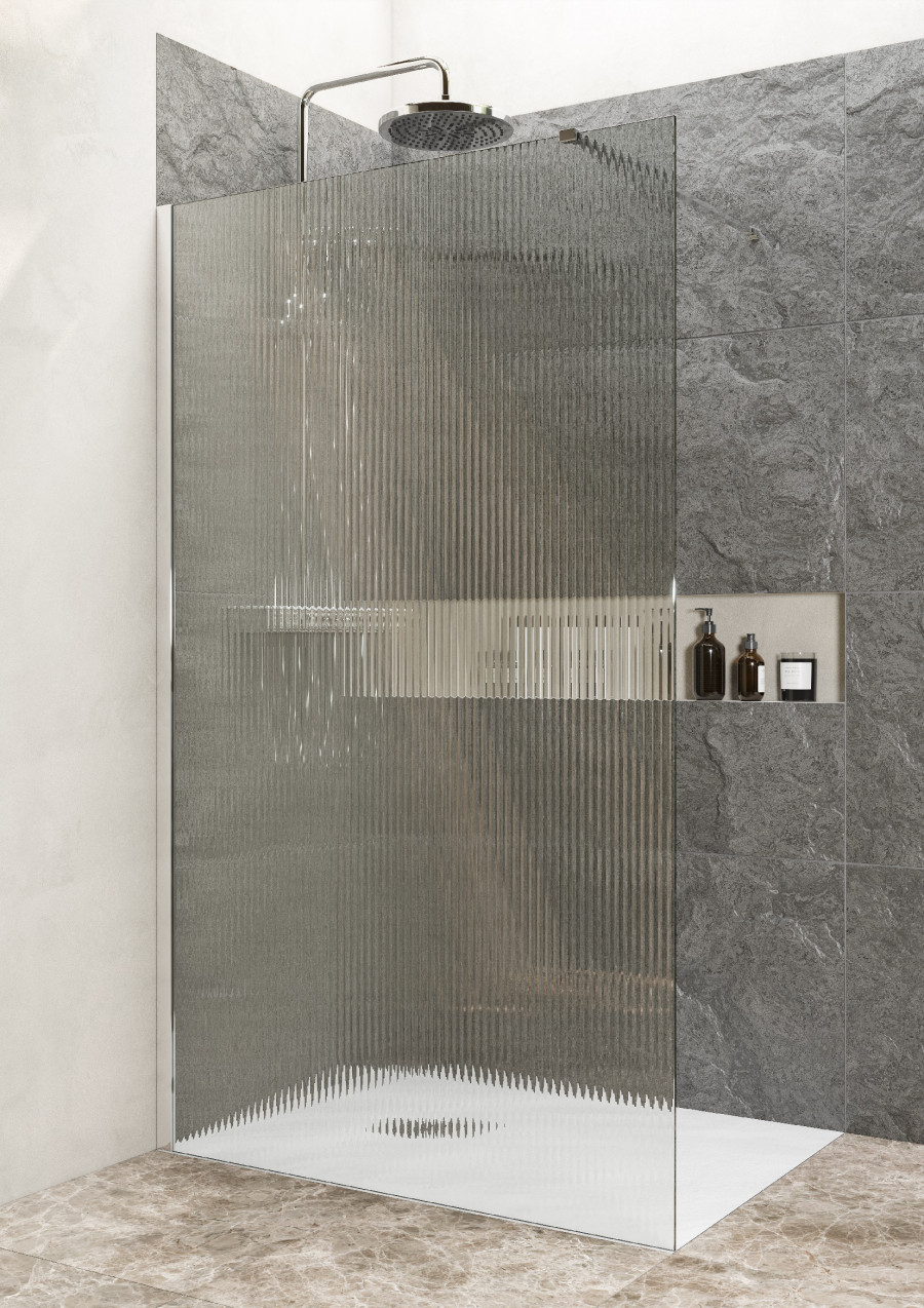 Душевое ограждение Metropolis Walk-In для свободного входа в душевое пространство выполнено из безопасного закаленного стекла 8 мм с гидрофобным покрытием MaxiClean. Утонченный рифлёный тип стекла создает эффект размытого силуэта. Алюминиевый хромированный профиль надежно фиксирует ограждение к стене, а специальный фиксатор позволяет установить данное ограждение в душевое пространство шириной до 1200 мм. Для установки на пространство менне 1200 мм, фиксатор просто подрезается. Возможен монтаж без душевого поддона.
