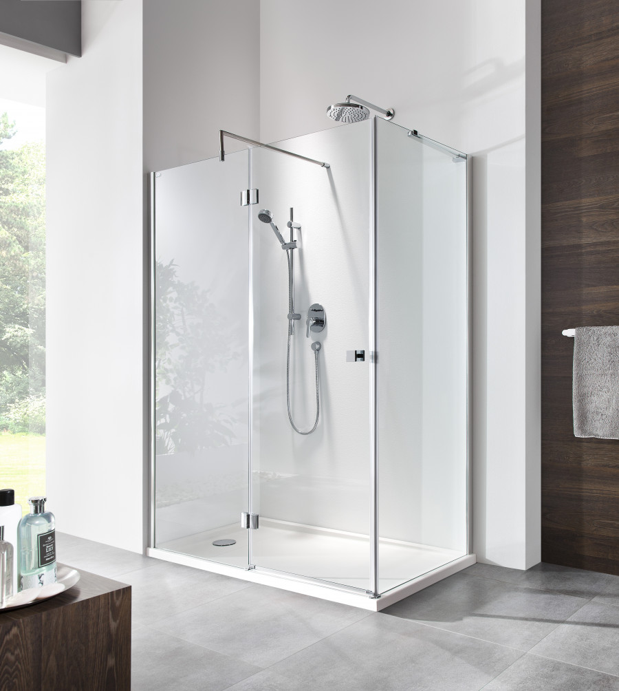 Без профильная облегченная конструкция Безопасное закаленное стекло 8 мм с покрытием MaxiClean Латунные хромированные петли Алюминиевые хромированные профили Высококачественные уплотнители Хромированный держатель стекла в комплекте Возможен монтаж без душевого поддона. Хромированный держатель стекла в комплекте