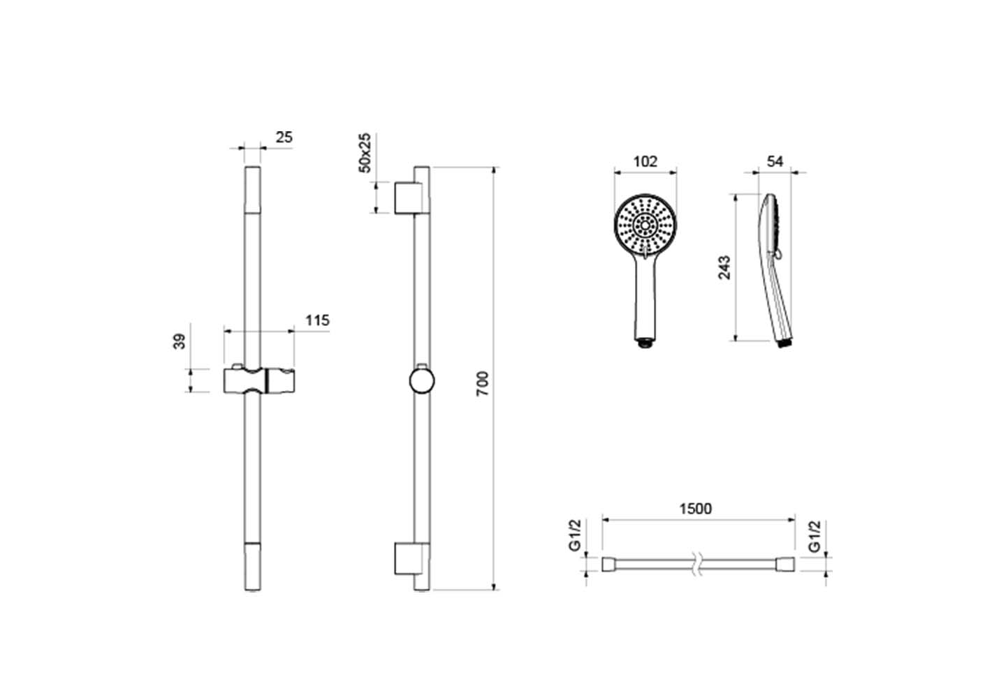 душевая штанга из нерж., ручной душ из пластика, 3 функции, душевой шланг из пластика, длина 1,5м,