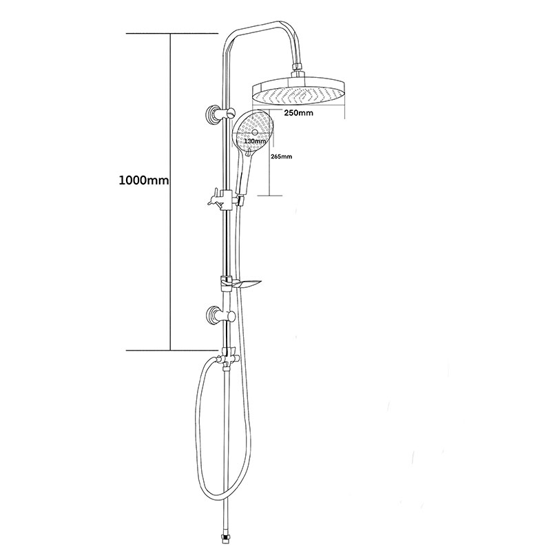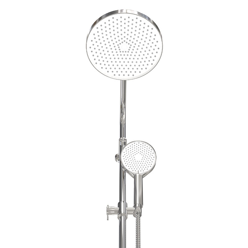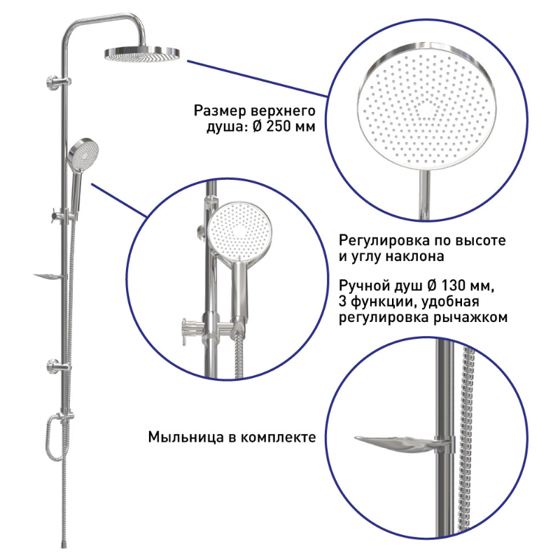 Хромированная душевая система без смесителя: держатель верхнего душа из нержавеющей стали, верхний душ из ABS пластика диаметром 250мм, ручной душ диаметром 130мм 3 функции, шланг хромированный длиной 1,5 м, дивертор ABS, мыльница в комплекте.