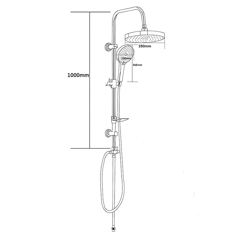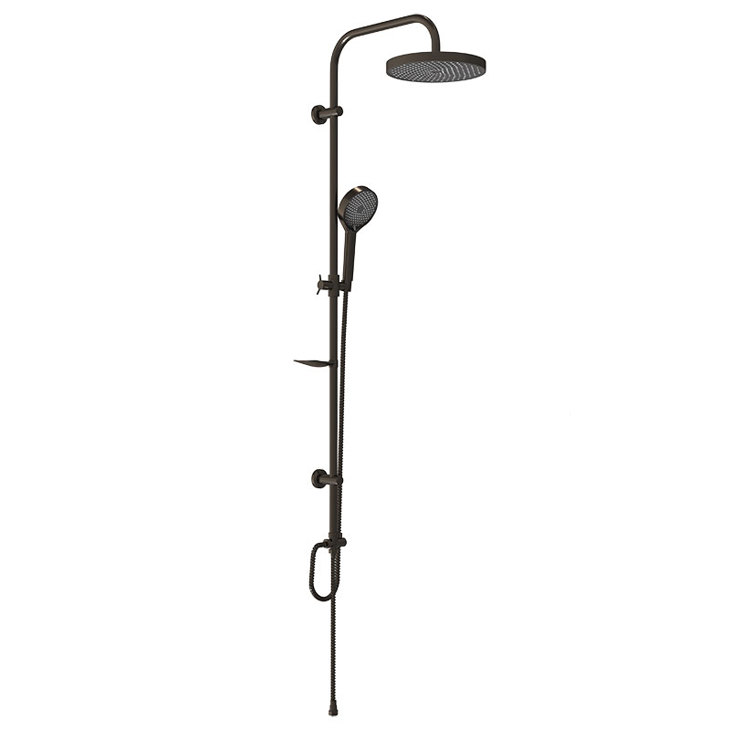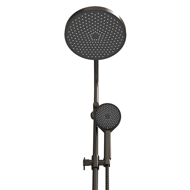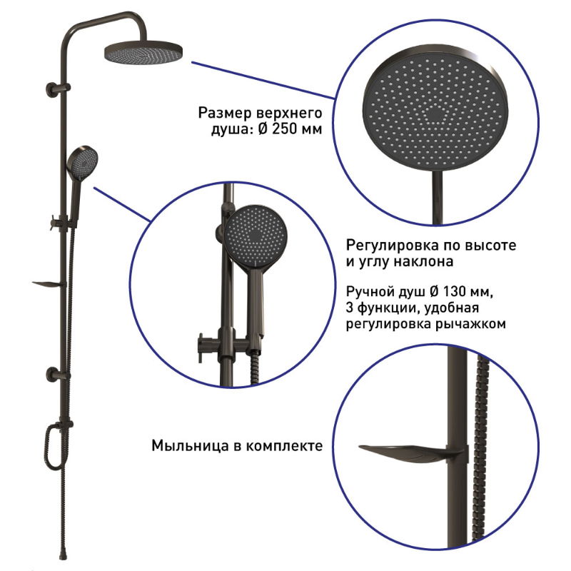 Душевая система без смесителя: держатель верхнего душа из нержавеющей стали, верхний душ из ABS пластика диаметром 250мм, ручной душ диаметром 130мм 3 функции, шланг длиной 1,5 м, дивертор ABS, мыльница в комплекте. Комплект в цвете оружейная сталь.