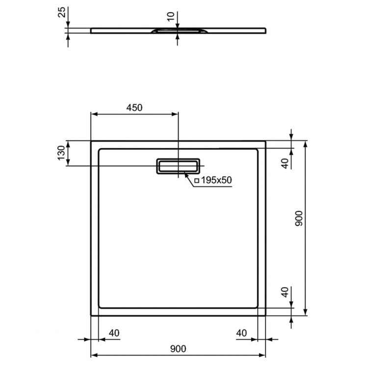 ULTRAFLAT NEW Ультратонкий акриловый квадратный душевой поддон 900x900x25 мм. Для напольной или встраиваемой установки. Сифон с декоративной прямоугольной черной крышкой (T4493V3) заказывается дополнительно