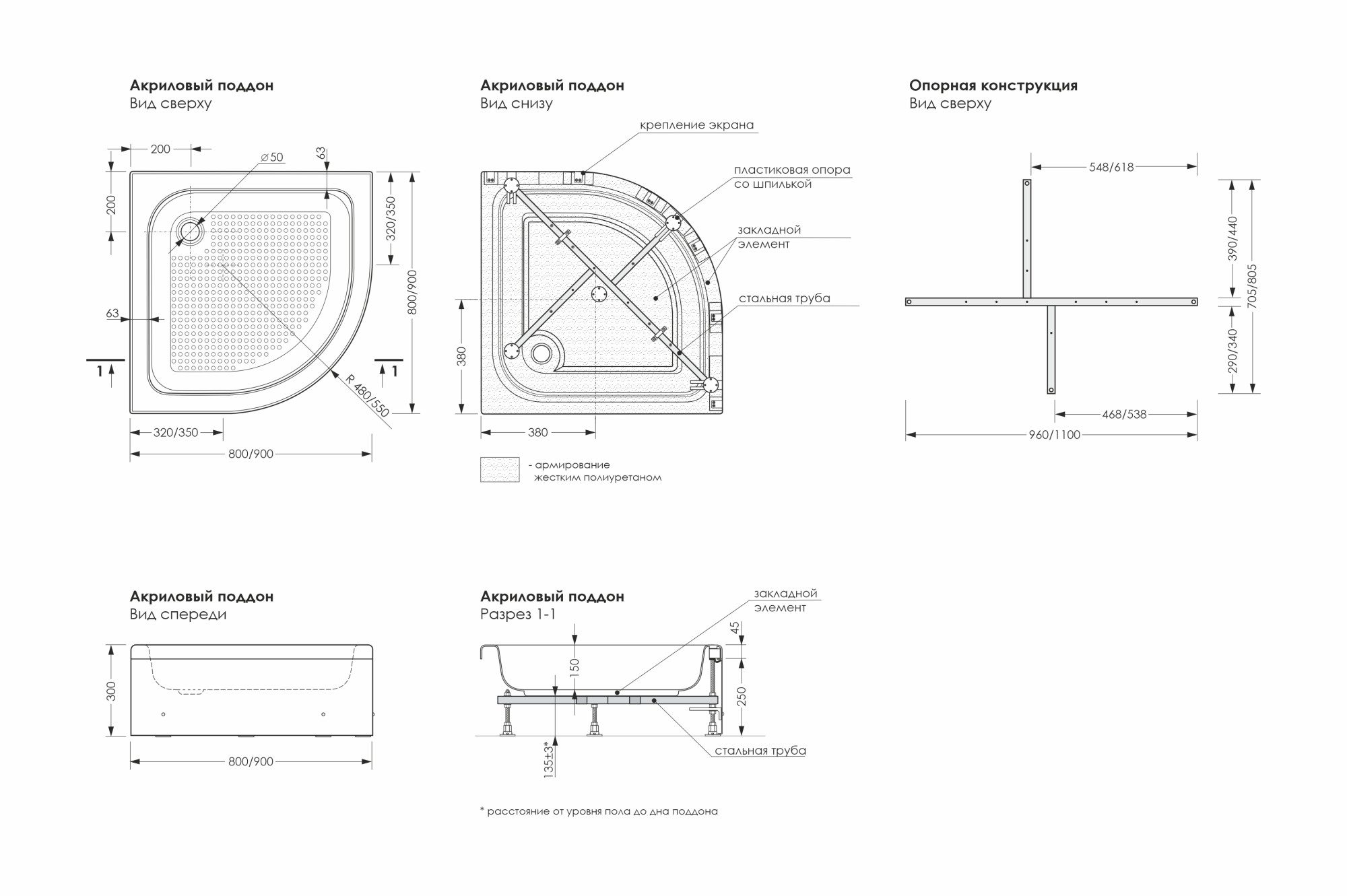 Акриловый душевой поддон полукруг«Classic S» 800x800 (И=300мм, d сливного отверстия = 60 мм, сварная рама, съемный декоративный экран).