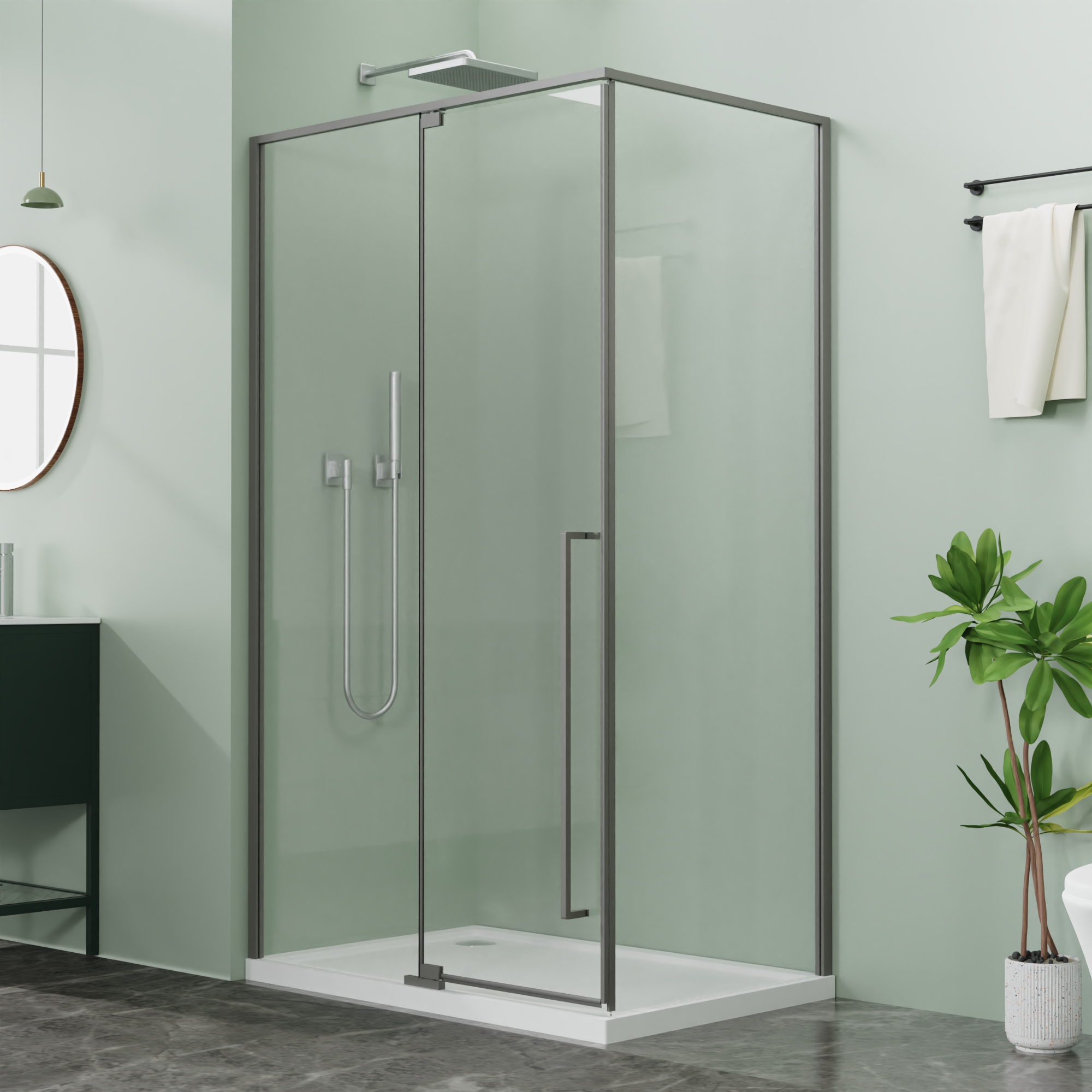 Квадратный или прямоугольный душевой уголок, с одной распашной дверью, на усиленных универсальных поворотных петлях из нержавеющей стали.