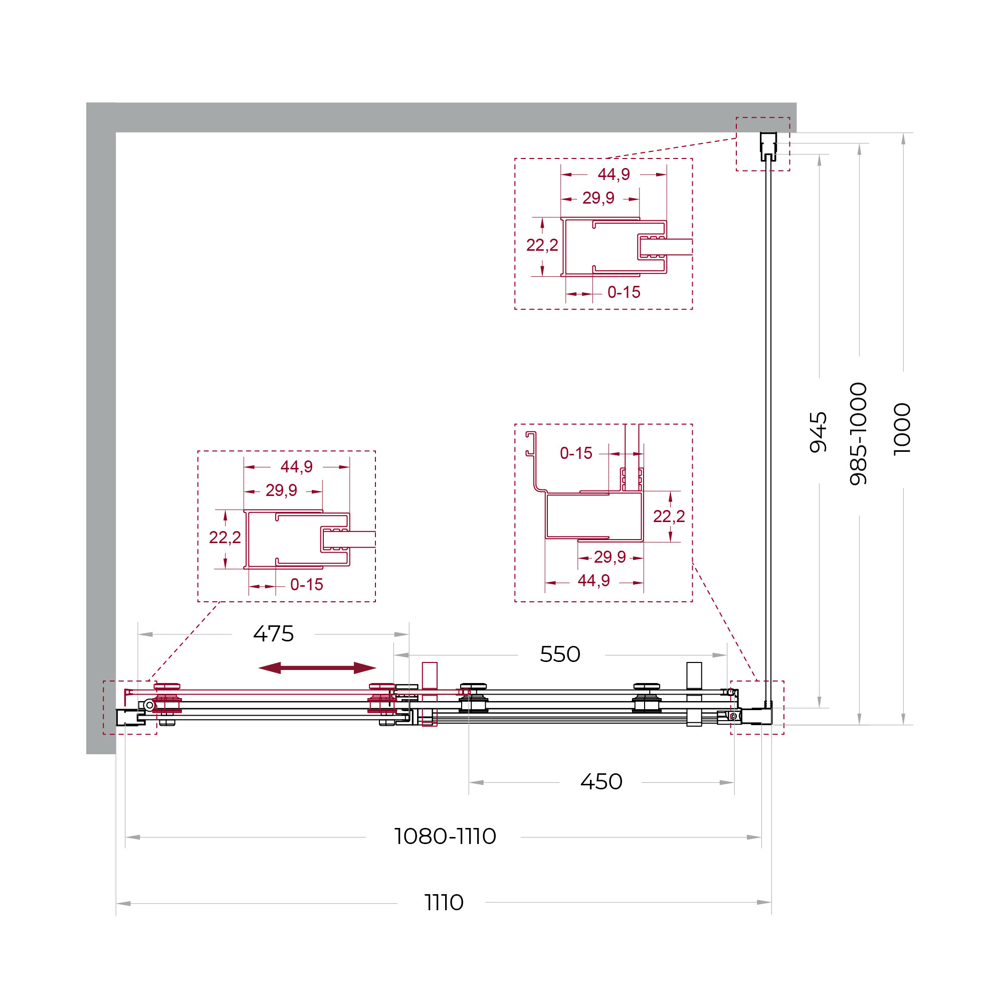 Раздвижные двери оборудованы одинарными роликами увеличенного диаметра, корпуса которых изготовлены из прочного сплава Zamak (цинко-алюминиево-магниево-медного состава) и нержавеющей стали. Такая комбинация материалов обеспечивает длительную и надежную эксплуатацию механизмов.