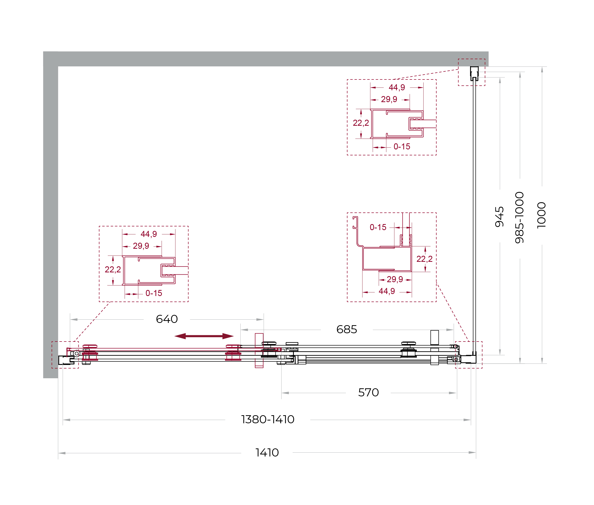 Раздвижные двери оборудованы одинарными роликами увеличенного диаметра, корпуса которых изготовлены из прочного сплава Zamak (цинко-алюминиево-магниево-медного состава) и нержавеющей стали. Такая комбинация материалов обеспечивает длительную и надежную эксплуатацию механизмов.