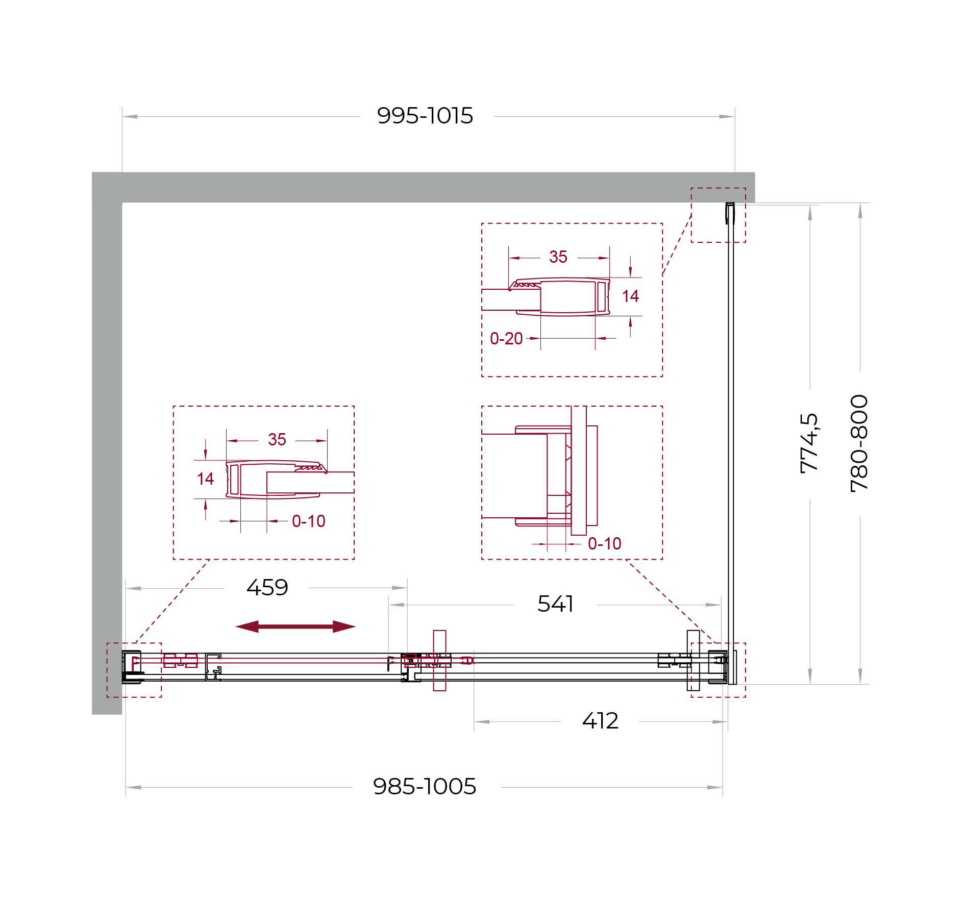 Система подвески: Двойные навесные ролики из нержавеющей стали с держателем стекла обеспечивают плавное движение створки, ее устойчивость и отсутствие перекосов.