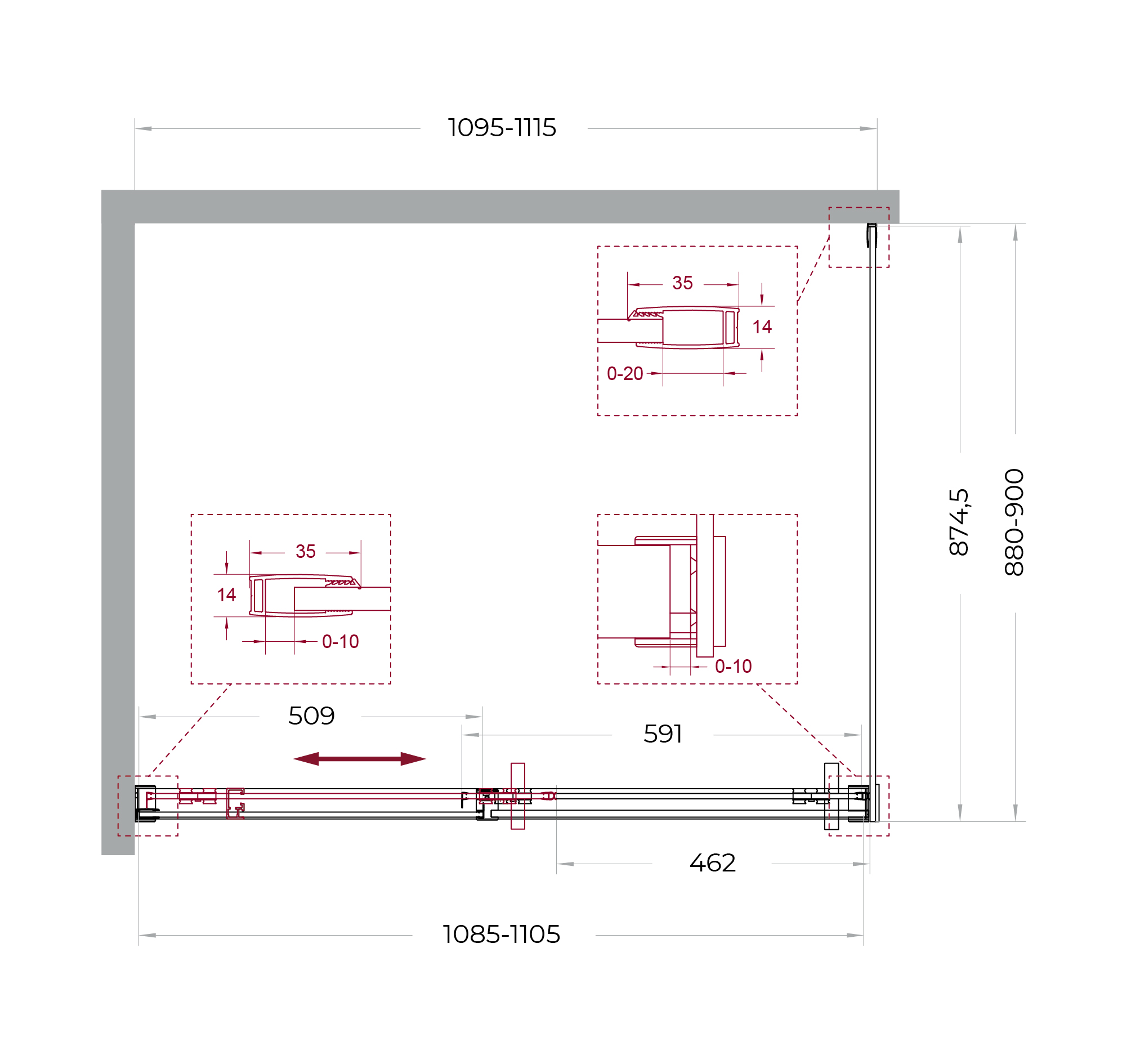 Система подвески: Двойные навесные ролики из нержавеющей стали с держателем стекла обеспечивают плавное движение створки, ее устойчивость и отсутствие перекосов.