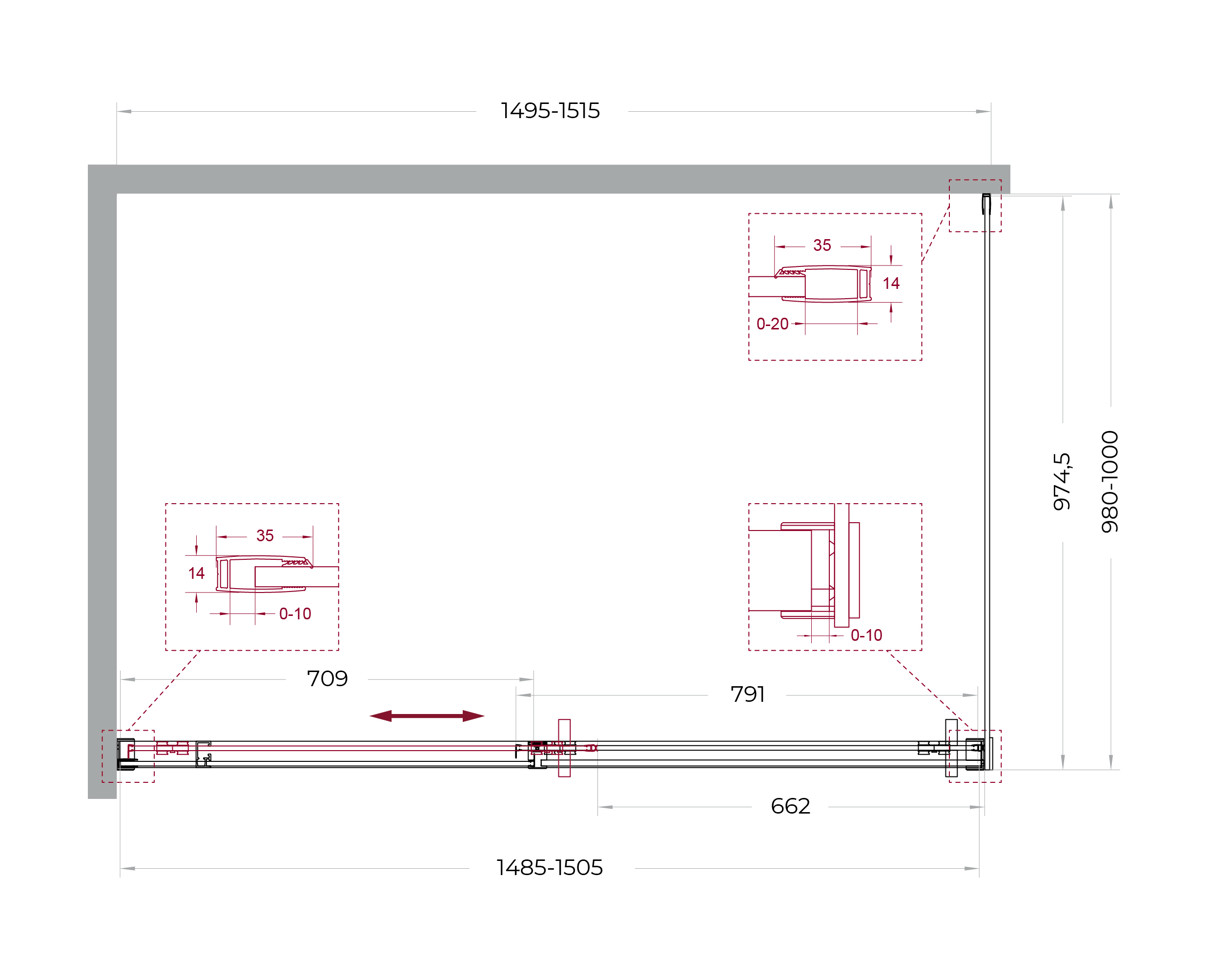 Система подвески: Двойные навесные ролики из нержавеющей стали с держателем стекла обеспечивают плавное движение створки, ее устойчивость и отсутствие перекосов.