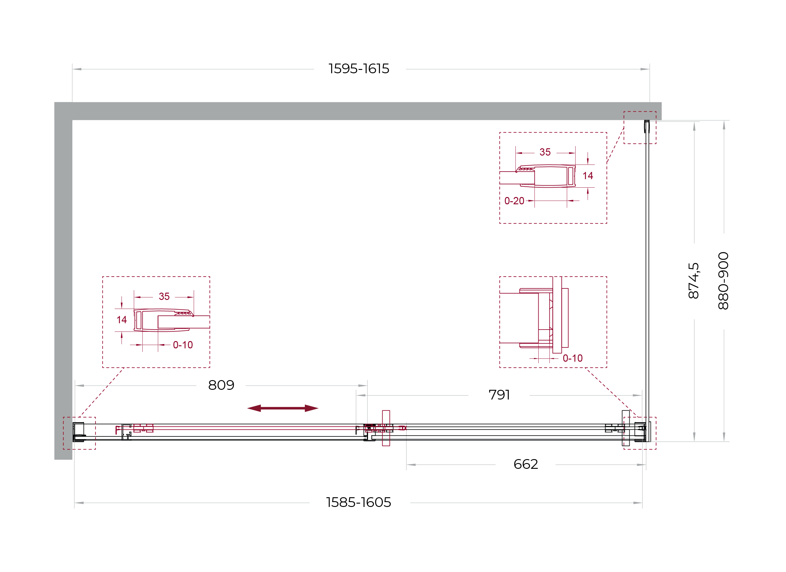 Система подвески: Двойные навесные ролики из нержавеющей стали с держателем стекла обеспечивают плавное движение створки, ее устойчивость и отсутствие перекосов.