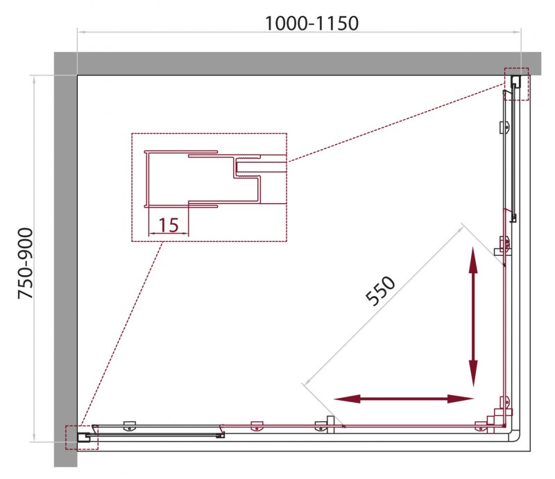 Габариты с диапазоном регулировок, мм - (1000-1150)x(750-900)x1900. Дополнительная информация: поддон приобретается отдельно.