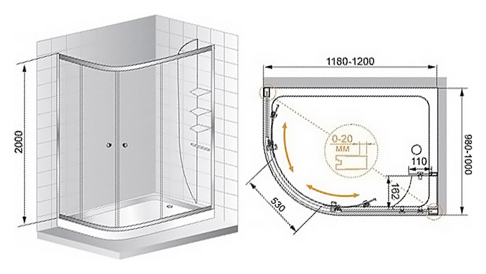 Особенности: оригинальная конструкция двойных роликов, белый магнитный уплотнитель дверей, стеклянные полки и полотенцедержатель в комплекте, специальное исполнение для высоких людей. Высота 2000 мм. Профиль хром, двойные ролики, 3 полки и полотенце, держатель, 2 дверки.