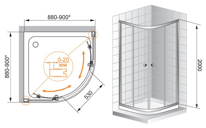 Габариты с диапазоном регулировок, мм:(880-900)х(880-900)х2000, ширина входа, мм:530