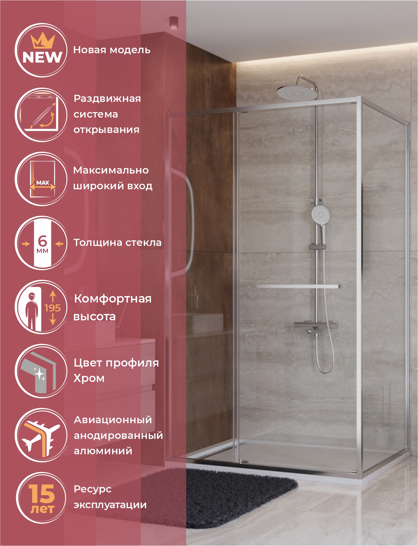 Коллекция включает шесть решений под любую задачу: квадратную (A-FS-1, A-FS-11), прямоугольную (AH-FS-1, AH-FS-11) и дверь в нишу (BF-FS-1, BF-FS-11). Высота 1950 мм и популярные размеры упрощают интеграцию в любое пространство.