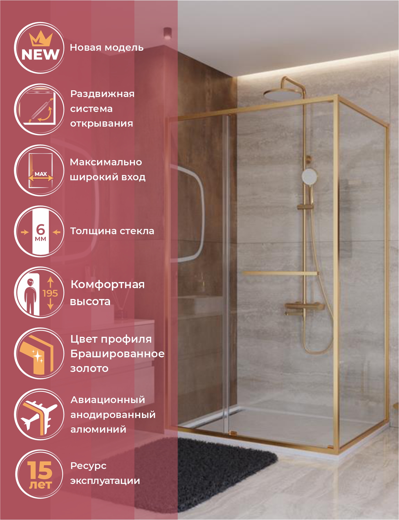 Узкие профили доступны в трёх вариантах отделки: хром, брашированное золото и оружейная сталь. Все они производятся из анодированного алюминиевого сплава, устойчивого к коррозии и влаге.