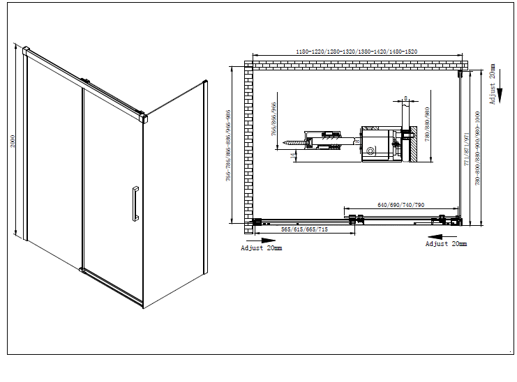 Габариты с диапазоном регулировок, мм:(1280-1320)x(780-800)x2000, ширина входа, мм:600