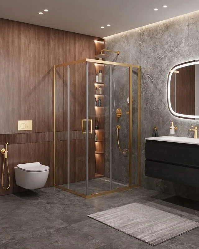 Душевой уголок Cezares Molveno 130x100x195 стекло прозрачное, профиль брашированное золото (MOLVENO-AH-21-100+30-C-BORO-IV)