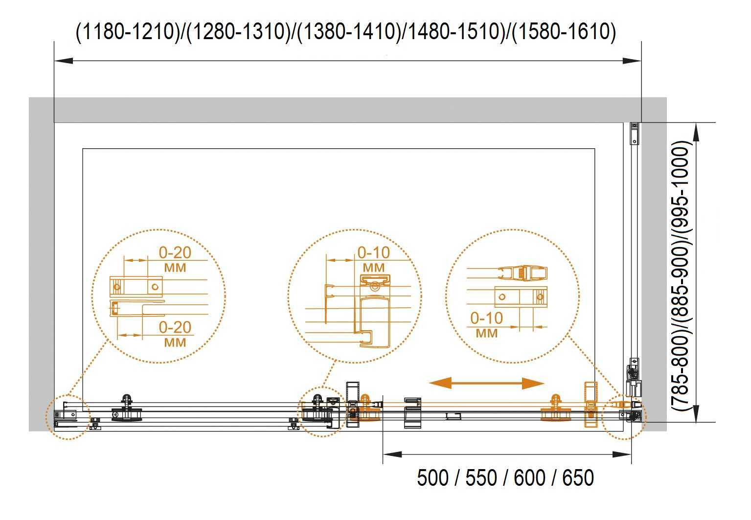 - Регулировка ширины: предусмотрена за счет боковых профилей