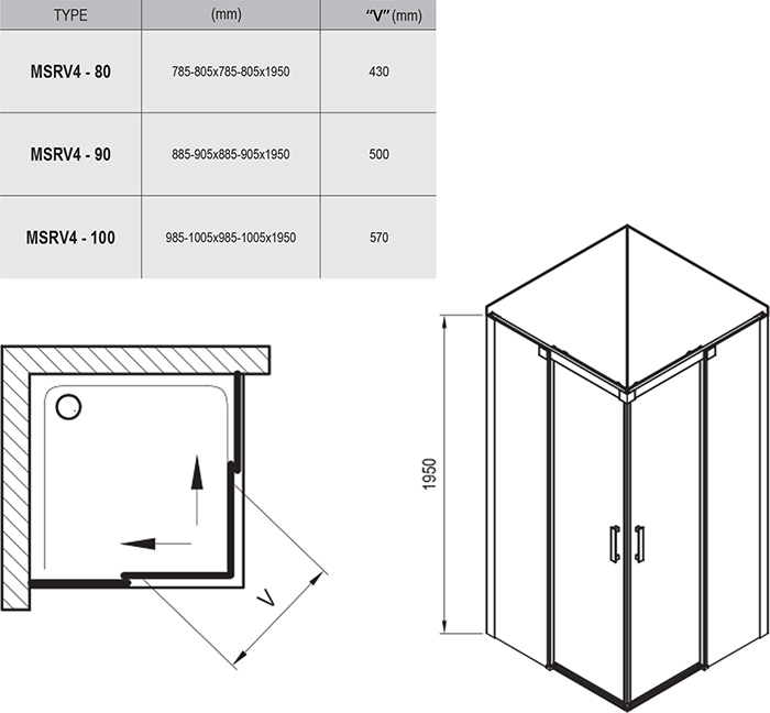 Изделие состоит из двух ровных неподвижных частей и двух ровных подвижных частей, образующих раздвижные двери. Устанавливается в облицованный кафелем угол ванной комнаты на поддоны RAVAK Perseus Pro Chrome или непосредственно на пол со встроенным душевым каналом.