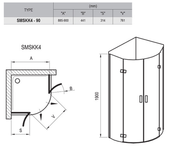 Душевой уголок SMSKK состоит из двух ровных частей и двух изогнутых частей, образующих двери поворотного типа. Устанавливается в облицованный кафелем угол ванной комнаты на поддоны RAVAK ELIPSO, ELIPSO PRO, ELIPSO PRO FLAT, ELIPSO PRO CHROME или непосредственно на пол со встроенным душевым каналом или трапом. С помощью установочного профиля можно исправить строительные неровности стен (по 1,5 см в каждую сторону). В комплектацию изделия входят 2x коротких держателя. Радиус 500 мм.