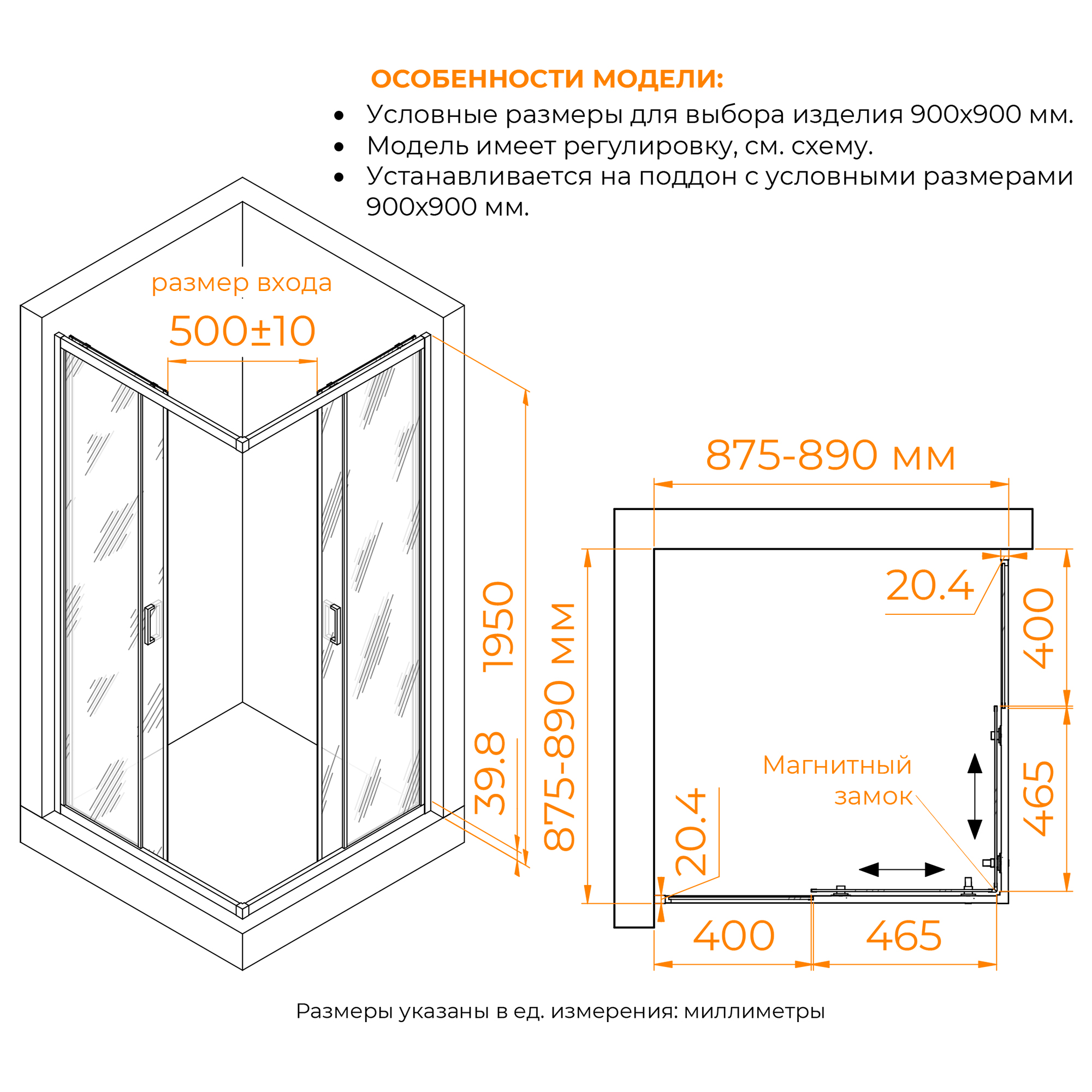 Душевой уголок квадрат, две раздвижные двери, алюминиевые профили в хромированной и черной отделке, пристенный профиль с регулировкой 15 мм, двойные ролики из ABS-пластика, закаленное стекло толщиной 6 мм, двойная цинковая ручка 145 мм, магнитные уплотнители из ПВХ. Логотип RGW на стекле. Инструкция, гарантийный талон и памятка входят в состав набора.